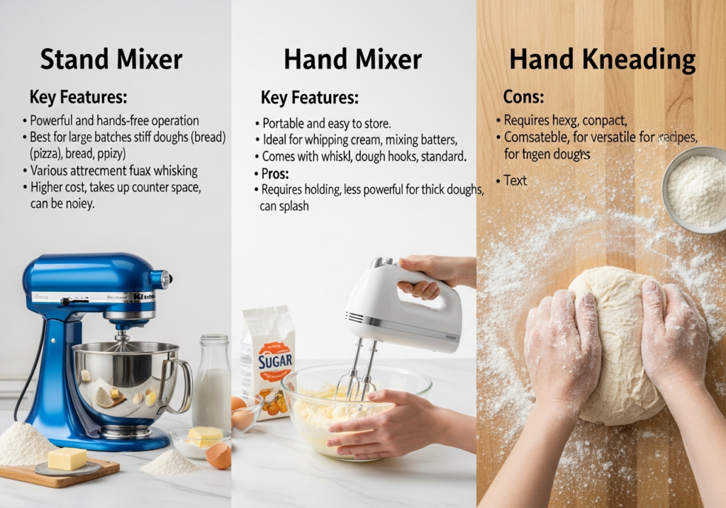 「お菓子やパンを作ってみたい」と思って道具を調べ始めると、必ずぶつかるのがスタンドミキサー・ハンドミキサー・手ごね、どれを選べばいいの?という疑問ですよね。